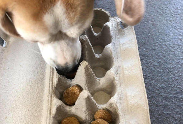 Use an empty egg carton to divide your dog’s dry food into the holes.