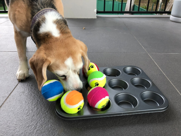 Divide your dog’s usual dry food into the cups of a muffin tray and place tennis balls on top.