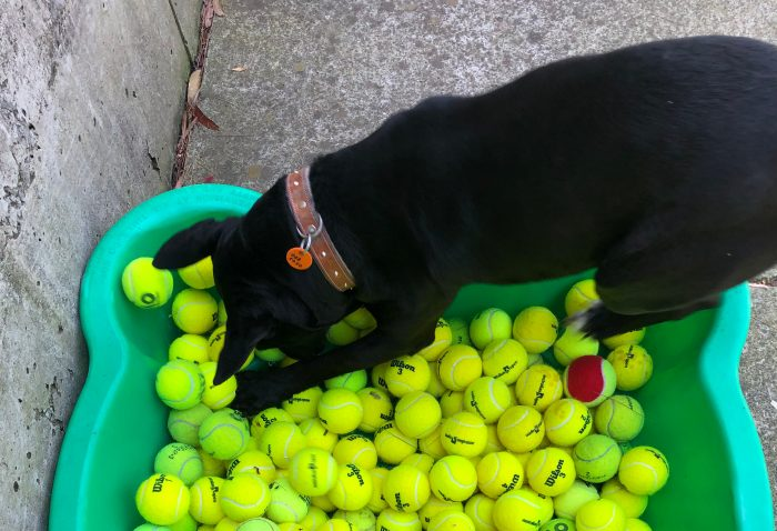 Fill a large clamshell with tennis balls and scatter your dog’s food throughout.