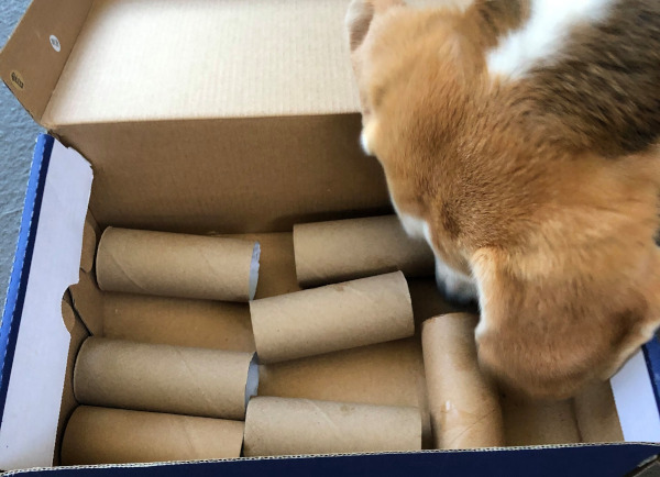 Put your dog’s usual dry food into toilet rolls (if you’ve got any!) and place them into a shoebox. Watch that nose work!