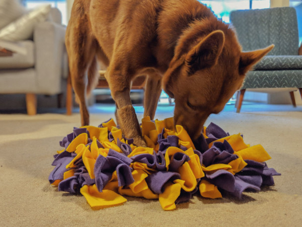 A snuffle mat is a toy that gives your dog (or cat!) the opportunity to sniff out hidden treats, or even just her dinner. Your pet’s natural foraging instincts will kick in so it’s a great way to keep her brain and nose occupied.