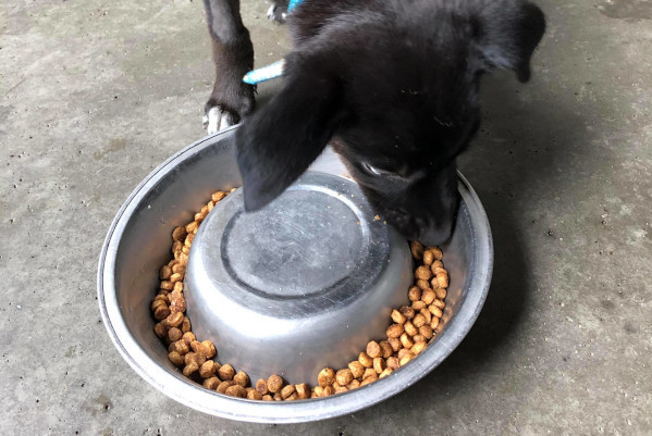 If your dog’s bowl has a rim underneath, like the one above, turn it upside down and put the food in the bottom.