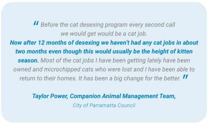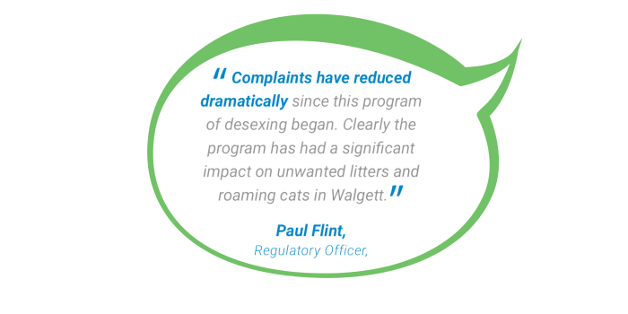 With Keeping Cats Safe at Home, our targeted feline desexing programs have been more impactful than ever before. More than 1,500 cats – most of whom started life as unowned strays – have been desexed thanks to the help of more than 25 veterinary practices. These programs have resulted in substantial reductions in the number of impounded cats in addition to a reduction in cat-related nuisance complaints made to participating councils.