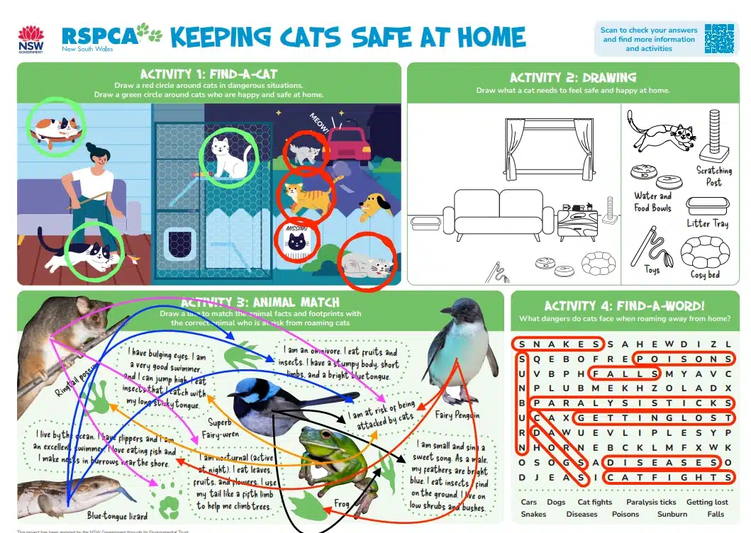 RSPCA NSW recommends introducing children to simple concepts like why cats roam, what dangers they face outside, and how containment keeps both cats and wildlife safe. Adults can use the provided activities, videos, and guided learning tools to spark discussions about road safety, environmental protection, and kindness toward animals. These resources help children make connections between their everyday actions and the wellbeing of their pets.