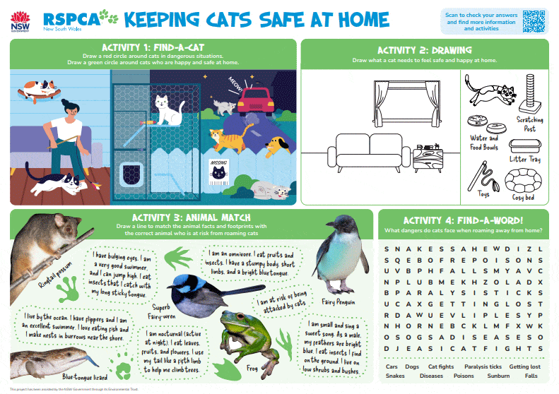 Children learn how roaming cats can harm native wildlife and why keeping cats at home is essential in Australia, where native mammals, birds, and reptiles are particularly vulnerable. The resources explain these ideas in age‑appropriate ways, helping children build empathy for both their pets and local wildlife. This encourages stewardship, environmental awareness, and thoughtful decision‑making.