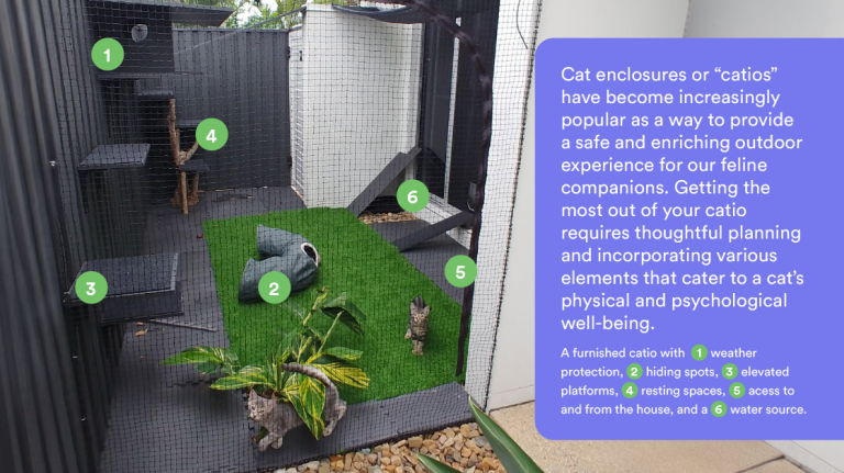 Cat enclosures, or “catios,” are one of the most popular options. These spaces can be as simple or elaborate as your home allows, but the most successful designs include a mix of shaded areas, elevated platforms, hiding spots, and comfortable resting places. Ideally, the enclosure is connected directly to the house, allowing your cat to move freely in and out of doors, giving them choice and control over how they interact with their environment.