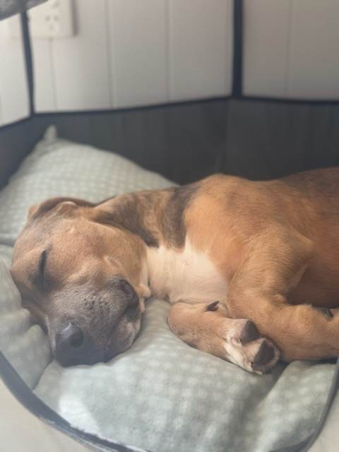 After 109 days of searching, Ross finally found his forever home. His family describes him as “a calm, beautiful boy who is so affectionate.”. The timid pup who once cowered in his kennel now only knows comfort, connection, and unconditional love. Ross spends his nights sleeping under his favourite blankets, tucked in with his own pillow, curled safely between the people who adore him most.
